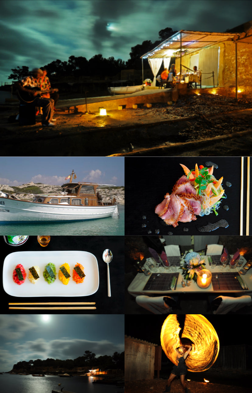 The evening starts by being chauffeur driven to a beautiful secluded beach where you board a handmade wooden fishing boat to watch the sunset. On return to shore you will be greeted by your personal waitress and shown to your table. Dinner consists of four plated courses cooked by Ibiza's leading private chef and best selling author, Sid Shanti. Live acoustic music is played during dinner and after dessert it's time for an awe inspiring fire show. When ready, your car and chauffeur will take you to the location of your choice.